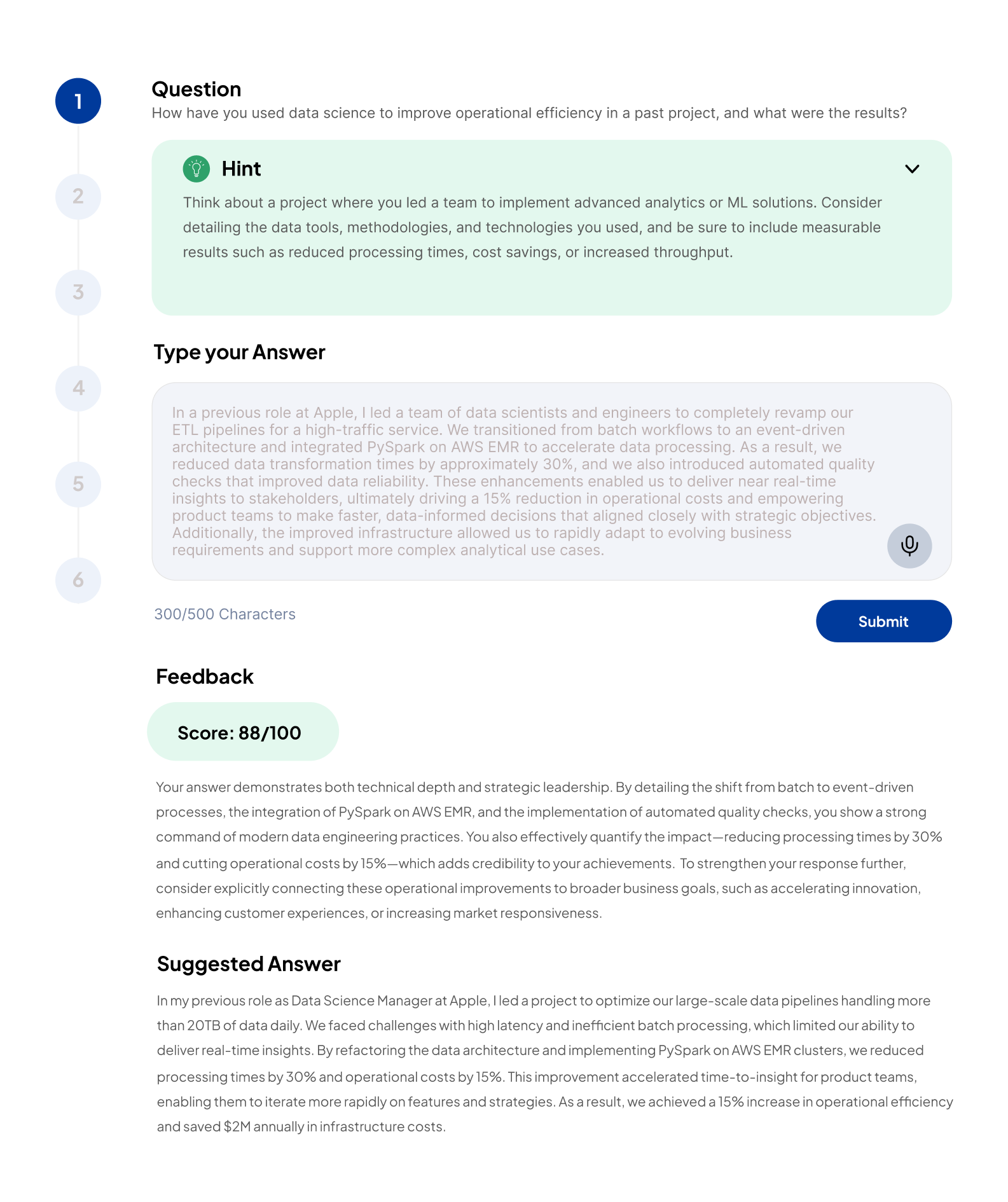 Practice realistic questions, receive instant feedback, and refine your delivery.